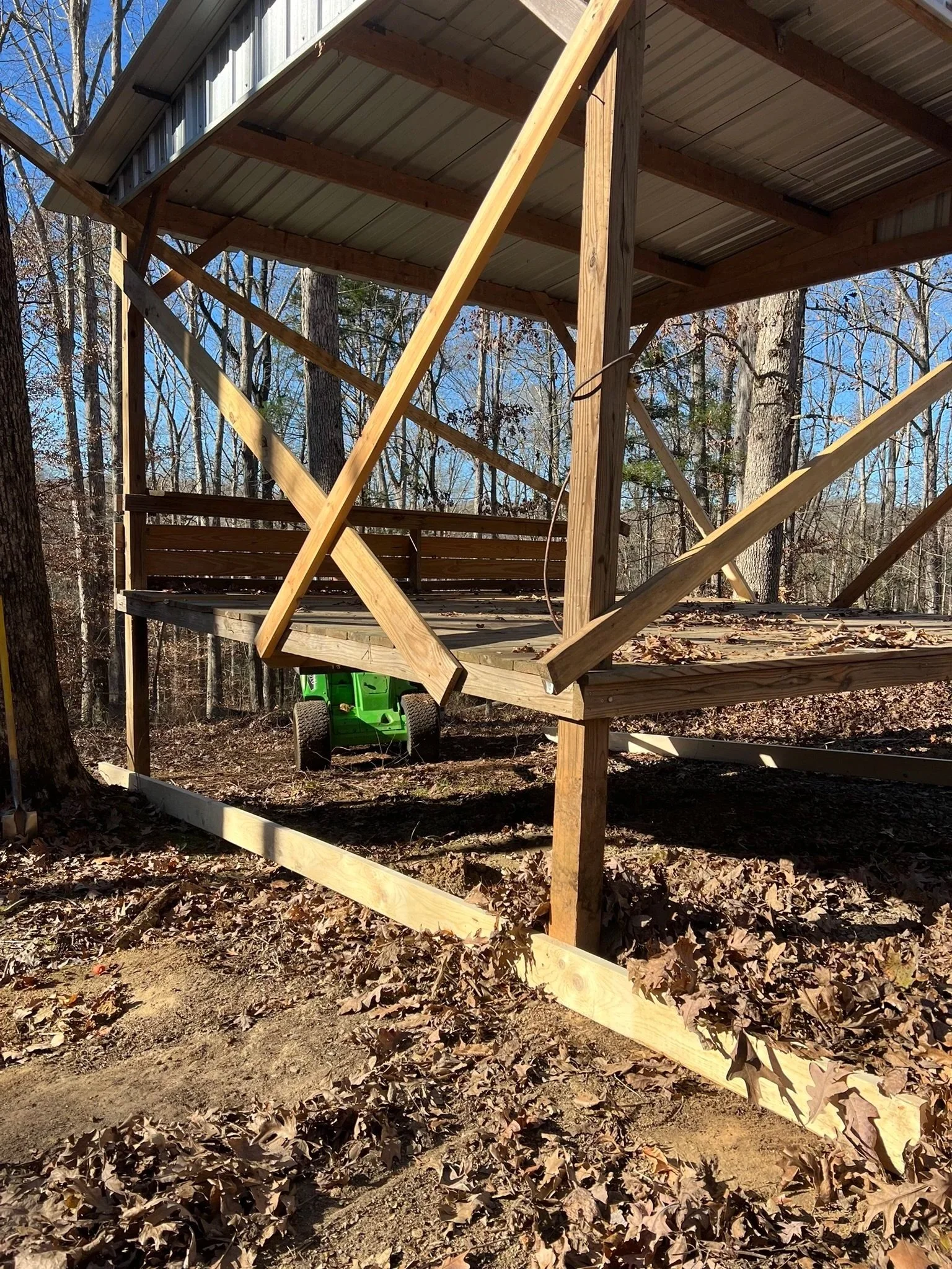 The Fruit Shack - second thing after site access. Good place to get out of the rain, sleep, stage equipment….. This was a 12x12 platform later covered with a roof. None of the boards were really cut. The idea being this 12’ material could be re used for the cabin build. Screws were used to aid in disassembly. This project occurred on 11-30-2018. A metal roof was added on Xmas weekend the following month.