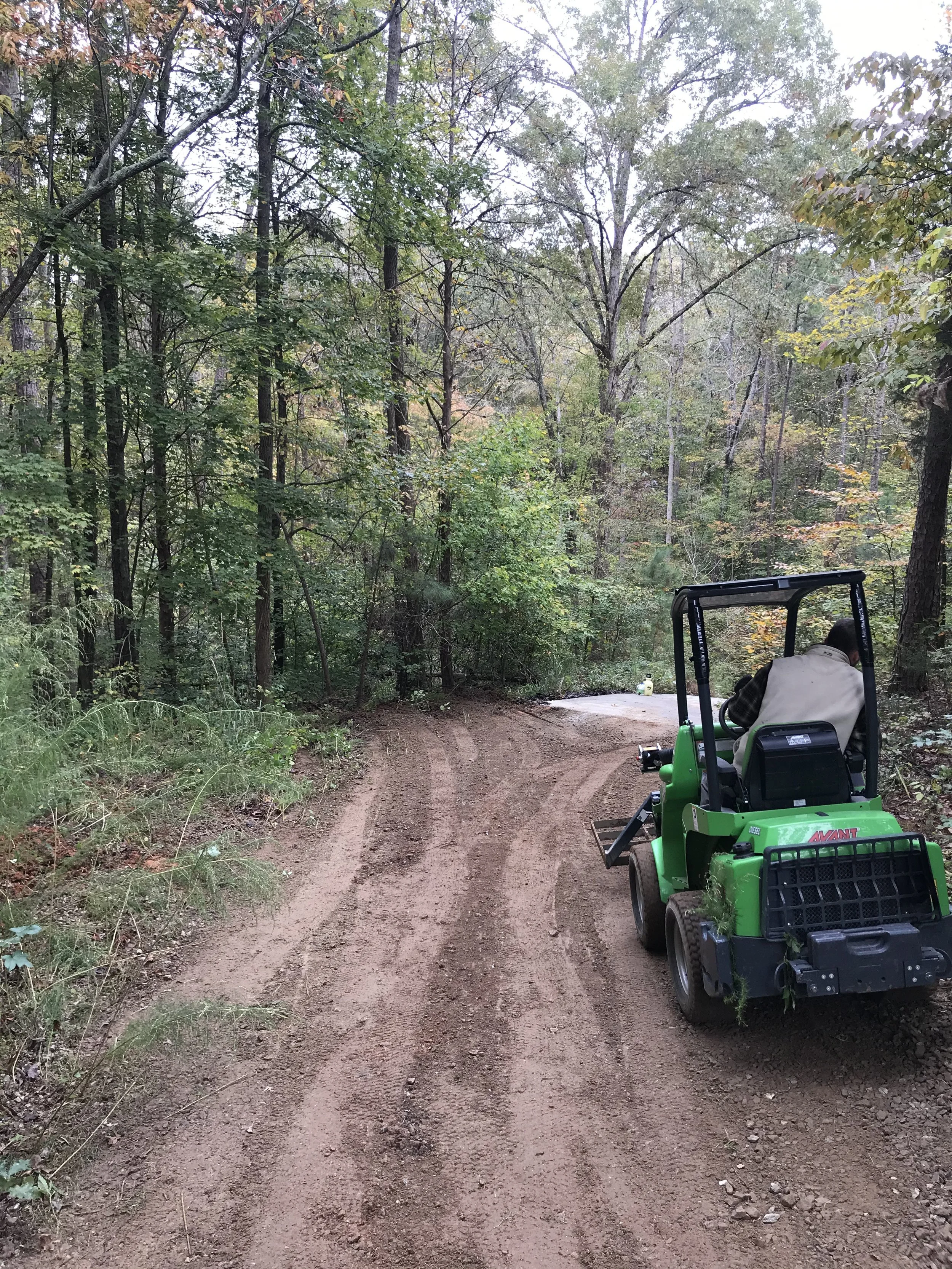There was pretty extensive damage done to the road because of a major rainstorm. Russ also corrected some issues at the cabin. A load of crusher run was delivered and dropped near the cabin site. That portion of the road was really washed out as well. Video below shows Russ contouring the top of the driveway, creating a slope for the run off to prevent it from just following the road and going down the driveway. This should divert rain water prior to reaching the concrete. See video below, Nov 6 2021.
